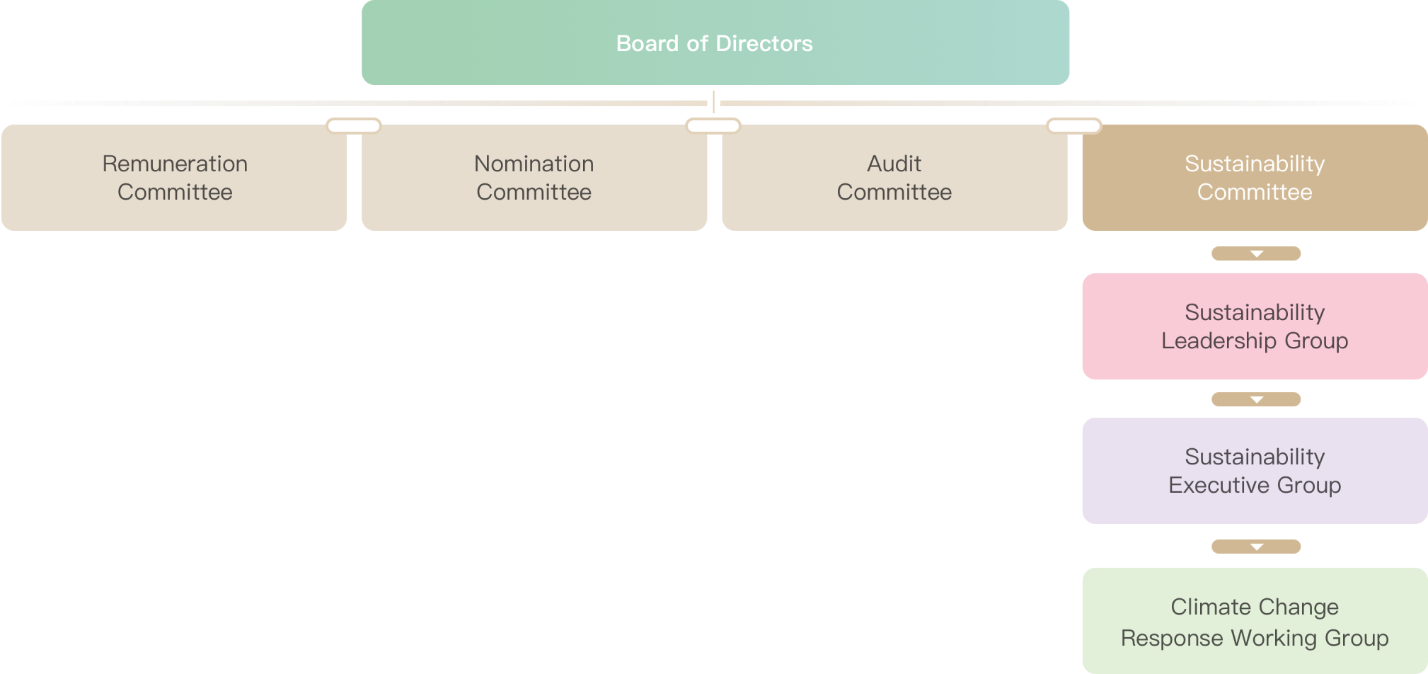 Sustainability Leadership GroupSustainability Leadership GroupCoordinate and arrange climate-related risk mechanism and work mechanism; Take charge of overall implementation of climate-related strategies and targets; Assessing specific climate-related risks and opportunities; Supervise the implementation of climate-related risk and opportunity management; Review climate-related risk management performance and report to the Sustainability Committee;