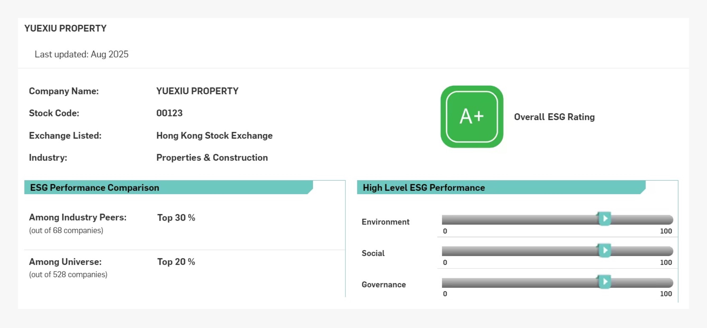 On August 28, 2025, the Hong Kong Quality Assurance Agency (HKQAA) and Hang Seng Indexes Company Limited released their annual sustainability ratings. Yuexiu Property earned an “A+” rating, better than last year. That is also the third year in a row the rating of the company climbed, fully reflecting the continuous enhancement it has made in sustainability management, information disclosure, and substantive performance, helping consolidate its industry leadership.