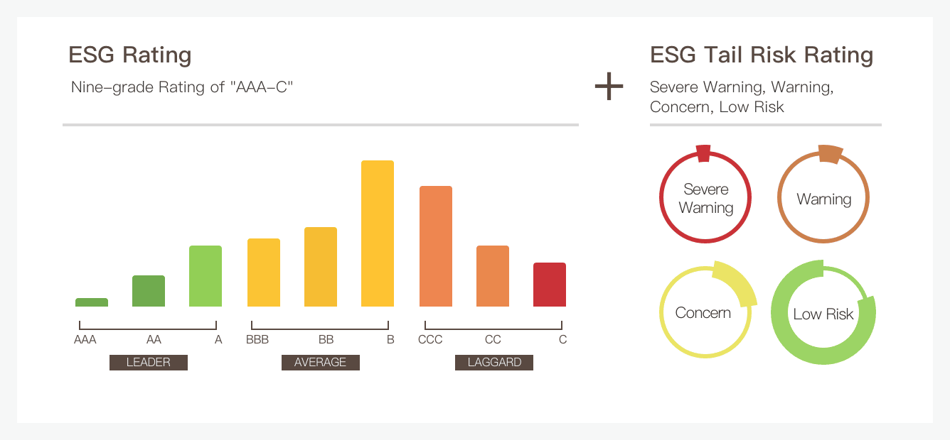 Sino-Securities Index is a professional institution specializing in index and index-based investment services, as well as ESG rating services. Its ESG rating system draws upon international mainstream methods and practical experience, while closely integrating with conditions in China and capital market characteristics. The system employs a nine-grade rating scale from “AAA” to “C” and classifies risks into four categories: “Low Risk”, “Concern”, “Warning” and “Severe Warning.” It comprehensively evaluates corporate performance in three dimensions: environmental, social, and governance. Currently, with its ESG ratings covering all A-share listed companies and investable Hong Kong-listed companies, Sino-Securities prides one of China's leading ESG rating systems.