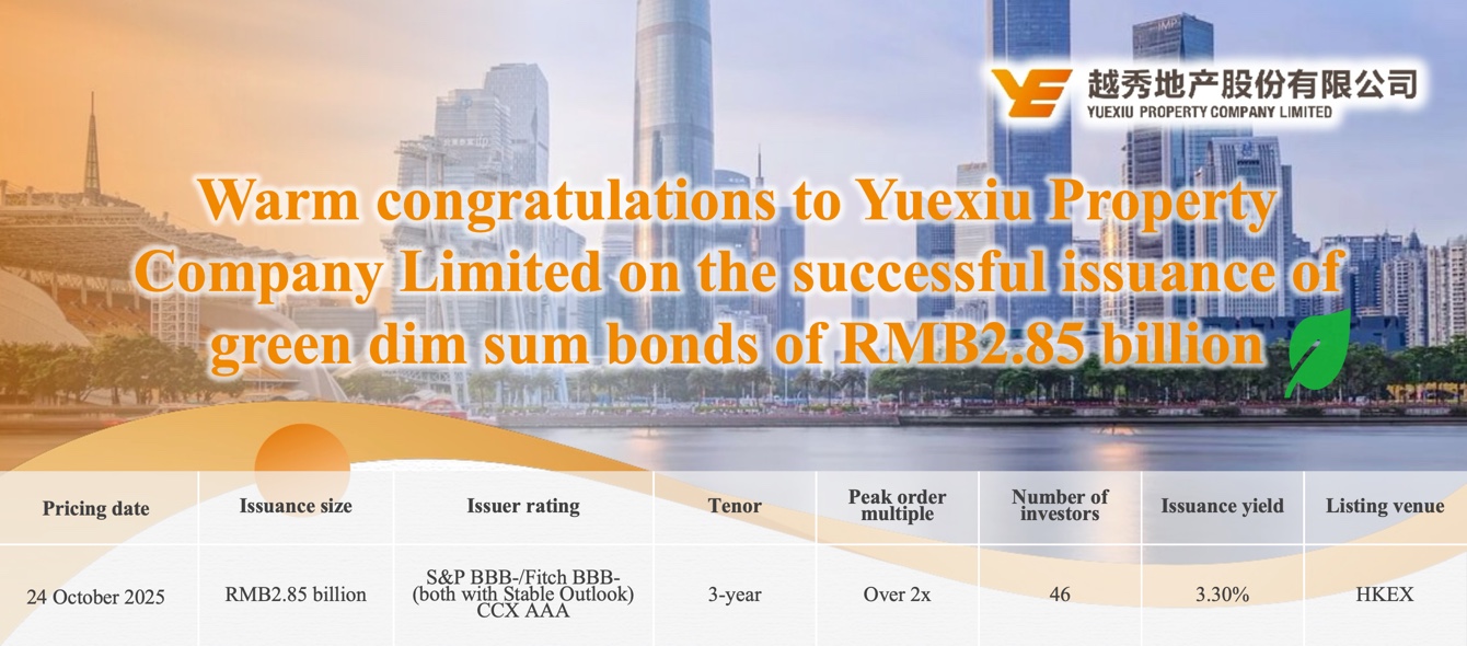 During the period of profound industry restructuring, Yuexiu Property has consistently adhered to its philosophy of “operating with prudence”. Through refining financial management, continuously optimising debt structure and maintaining robust cash flow, it has established differentiated core competitiveness. The issuance received enthusiastic market response, with the final spread narrowing by a significant 40 basis points from the initial price guidance, the largest spread narrowing for offshore RMB bonds issued by a Chinese property developer since August 2020. The strong market performance fully reflects the high recognition of investors for the Company’s credit standing and development strategy.