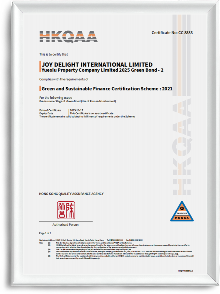 This issuance takes the form of a green bond, with proceeds to be allocated to various environmental projects aligned with the Company’s Sustainable Finance Framework, including green building development, energy efficiency upgrades, and renewable energy applications. This initiative is fully consistent with Yuexiu Property’s long-standing sustainable development strategy. Leveraging its deep expertise in green building and outstanding ESG management performance, the Company has consistently secured high ratings from domestic and international ESG rating agencies, establishing its green brand as a distinct financing advantage. The successful issuance of the green dim sum bonds further demonstrate the Company’s ability to transform ESG value into financial strength, further broadening its financing channels and reducing funding costs.