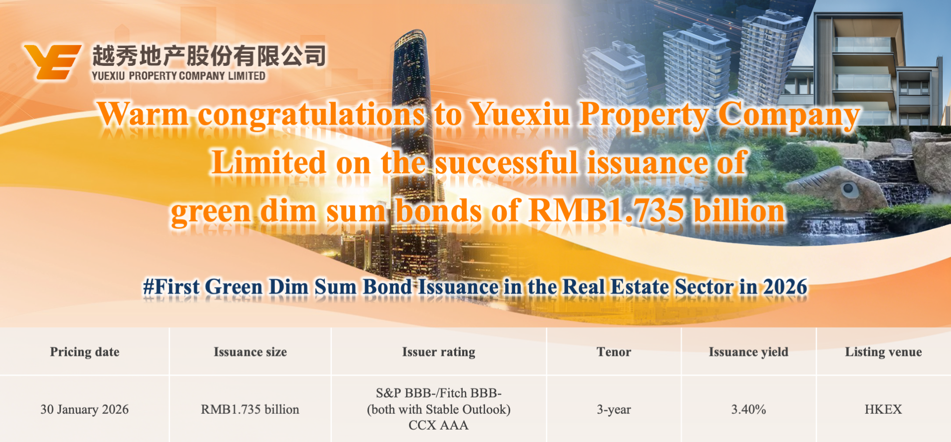 On 30 January 2026, Yuexiu Property Company Limited (Stock Code: 00123.HK) successfully issued US$250 million equivalent green dim sum bonds for a 3-year term with a coupon rate of 3.40%. Leveraging the Company’s high-quality asset profile and green finance attributes, this issuance attracted enthusiastic subscriptions from a diversified pool of domestic and international investors, achieving an overall book-building peak of nearly twice the issue size. Despite complex market conditions, the final pricing of this issuance was significantly compressed by over 50 basis points compared to the secondary market valuation of the Company’s comparable dim sum bonds issued in 2025. This not only achieved a substantial optimisation of financing costs but also instilled strong confidence into the market, demonstrating the capital market’s high recognition of the Company’s development prospects and creditworthiness.